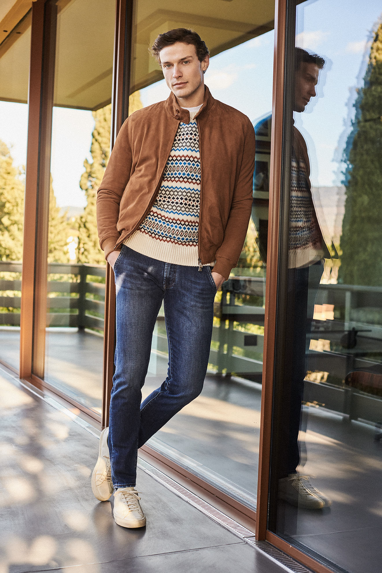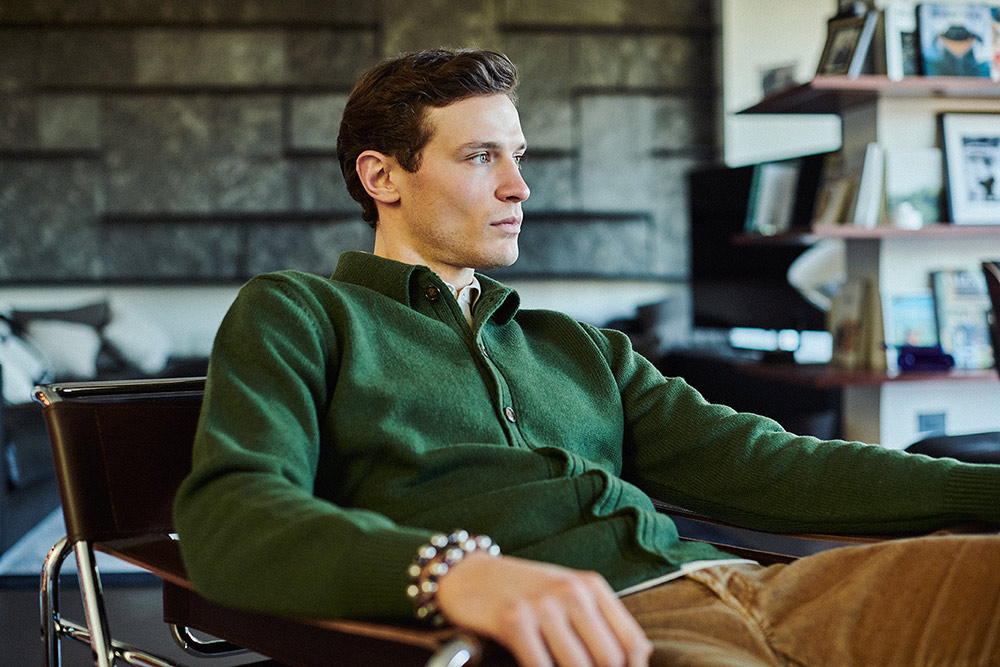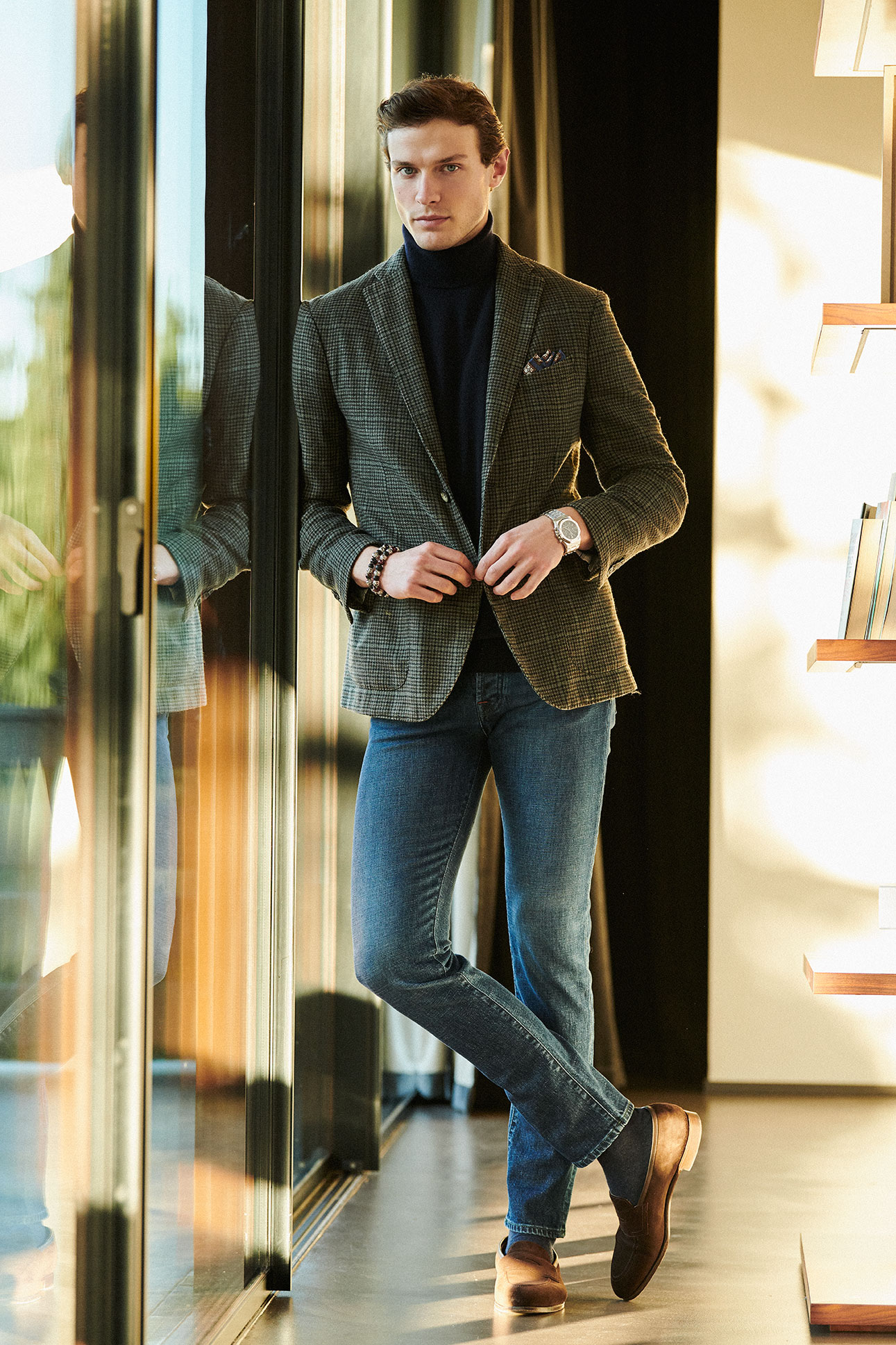 Ultra-refined collection featuring superb jeans with linings in different prints but always in harmoniously-blended colours; even the price-tags and the leather labels on the rear become style details. In fact the inside yokes are made from tie fabric originating from the historic English firm Stephen Walters, while those on the front are made of Japanese cotton. All the prints and threads are in the same shade to produce an effect of harmony. The price tag also includes a reel of thread for the hem colour-selected to match the other details.